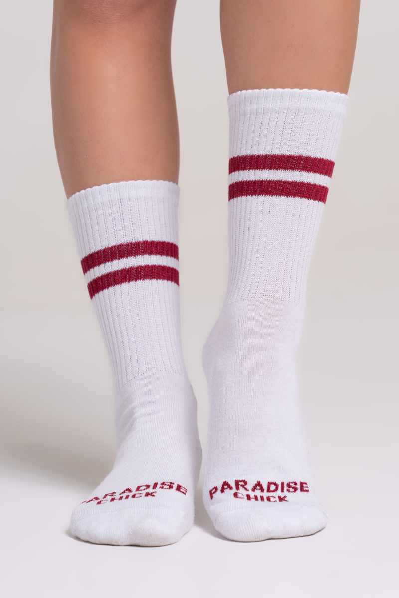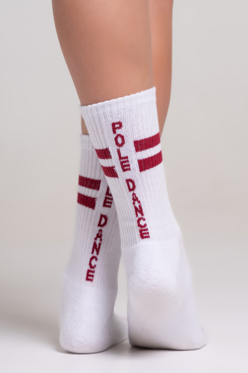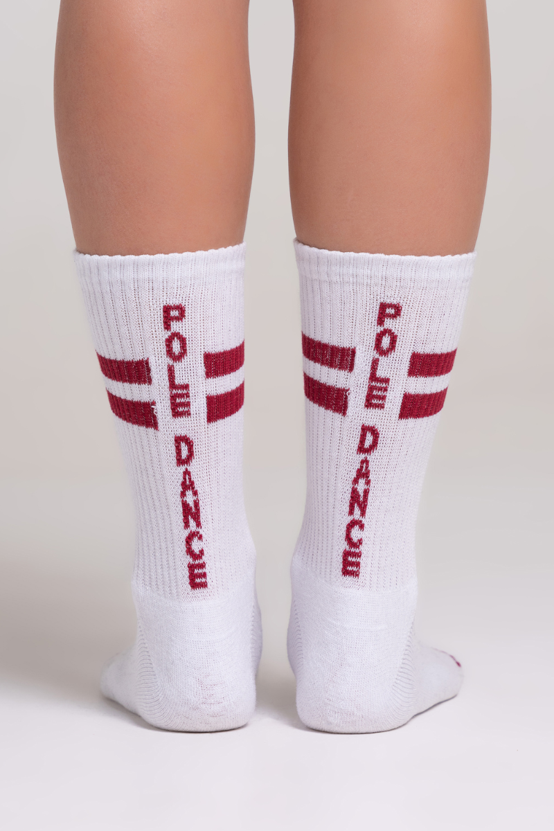 Nail your floorwork in style. These fresh white crew socks flash a burgundy double stripe and "Paradise Chick" toes. Complete with bold "Pole Dance" lettering down the back, they bring unapologetic attitude to your everyday flow.