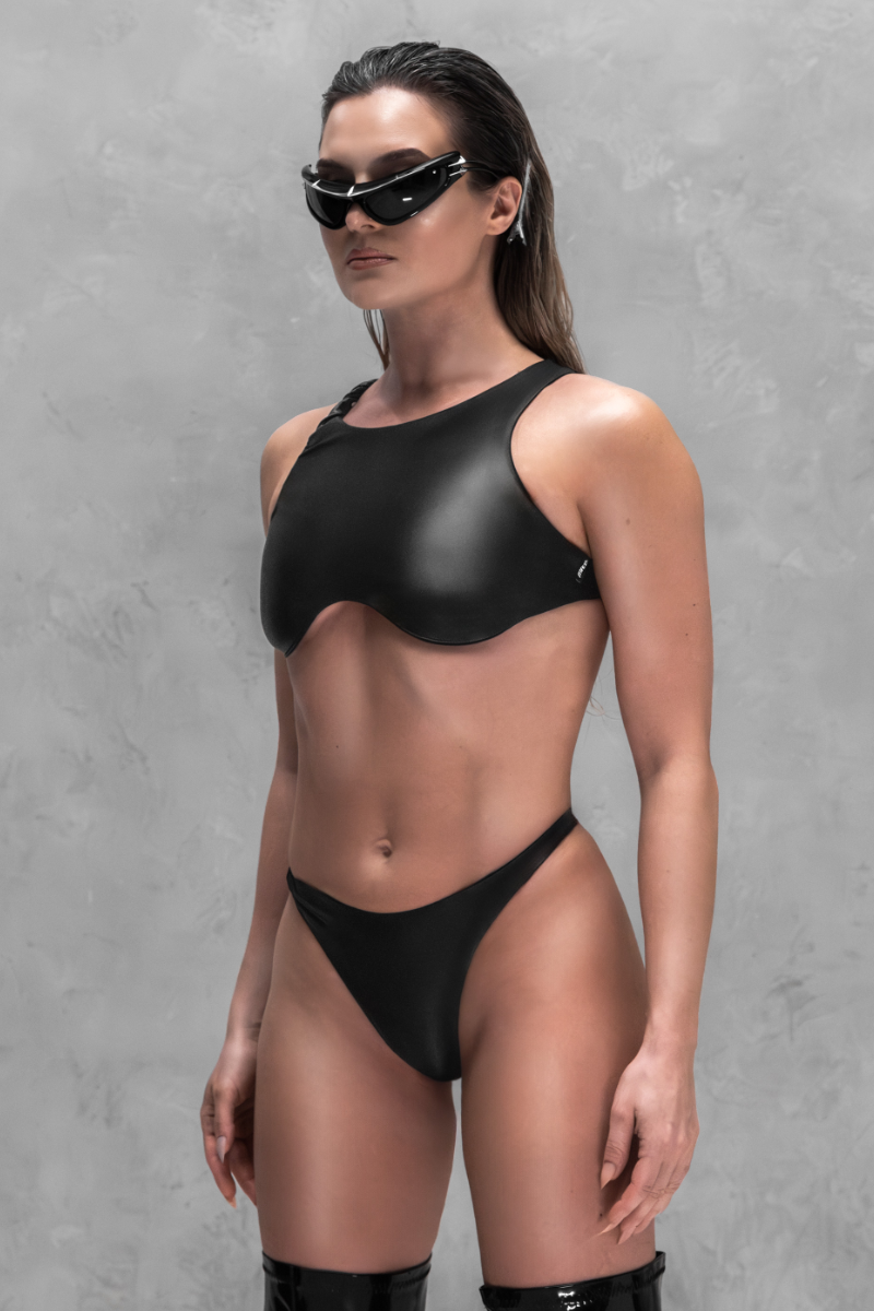 This high-rise thong, crafted from satin like High Shine lycra, catches the light with every move. Its premium double-layer fabric and single twisted seam sculpt your form, celebrating your curves with a flawless silhouette. Pure elegance with a rebellious edge.