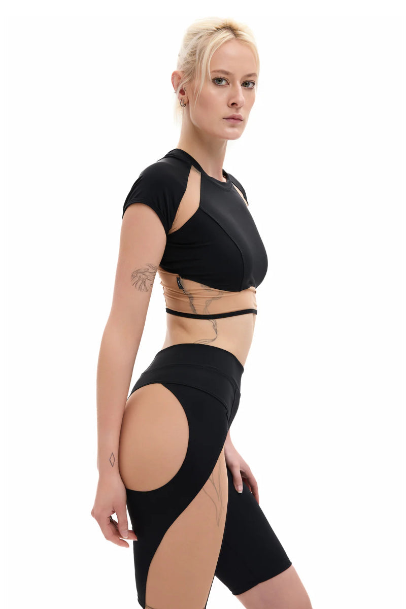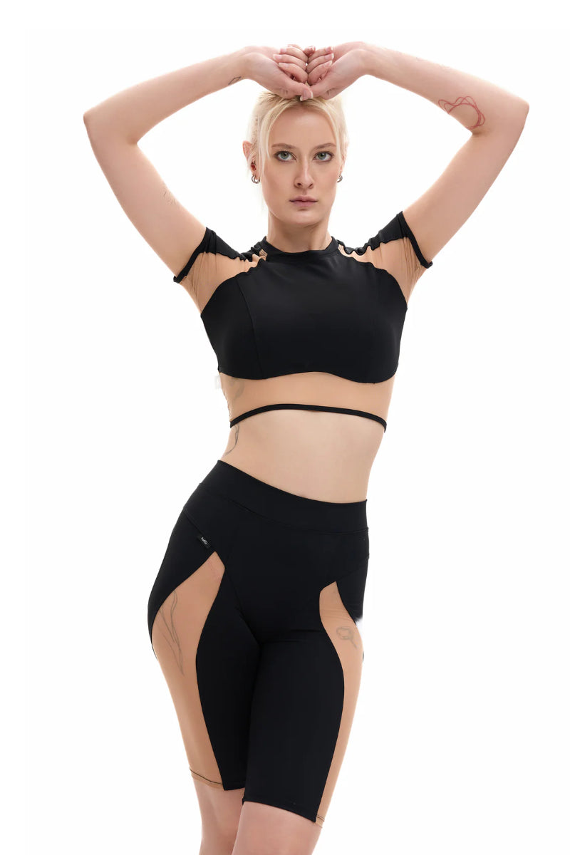 Lunalae Sasha V Cut Out Long Sleeve Top - Recycled Black Mesh