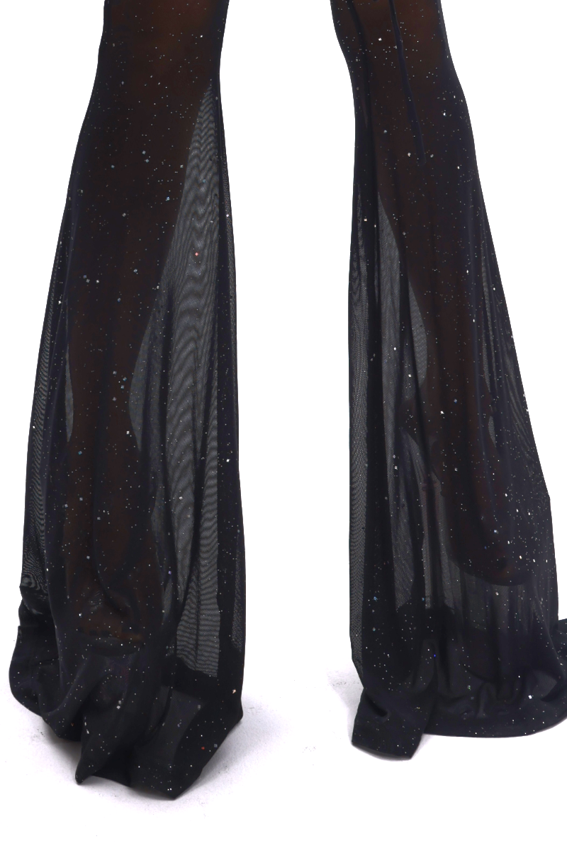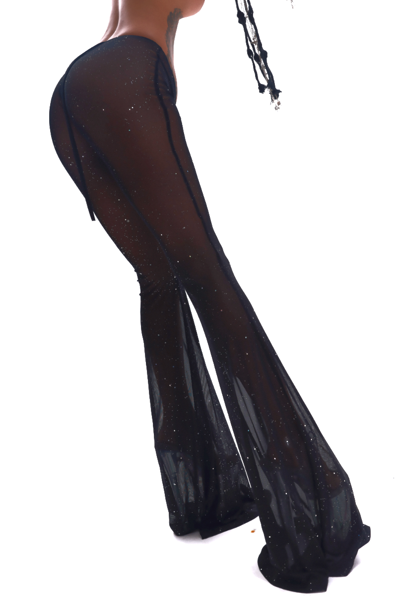 Own the darkness. These "Midnight" mesh pants are designed for the night crawlers. Scattered glitter mimic the stars, delivering serious galaxy vibes with every step. Cut with extreme length for your highest heels, the dramatic flare creates a silhouette that demands attention. Use the drawstring to adjust the rise. Sheer, shimmering, and unapologetically sexy.