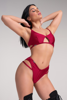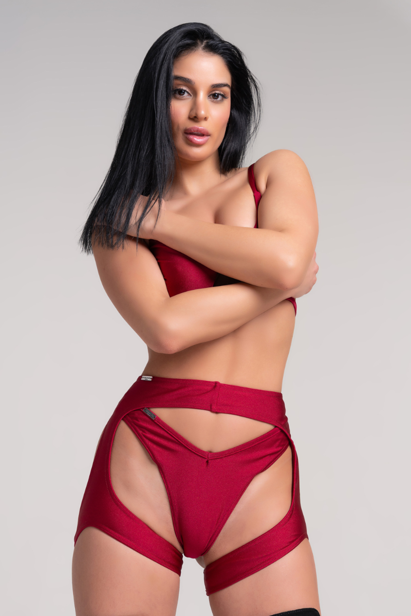 Dare to dip low. These passion red shorts are pure temptation, featuring a dramatic low 'V' rise waistline that commands attention. The playful hip strap detail and cheeky cut are designed to celebrate your curves and empower every move.