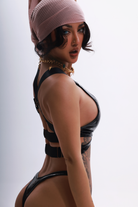 Armour up, angel. This high-shine top channels battlefield brilliance with a V-neckline and intricate cross-wrap front. The "Black Rainbow" finish shifts like an oil spill, creating a dark, iridescent shield. Finished with gold hardware and a strappy cross-back design, it’s adjustable to fit your unique shape. A striking fusion of strength and seduction.