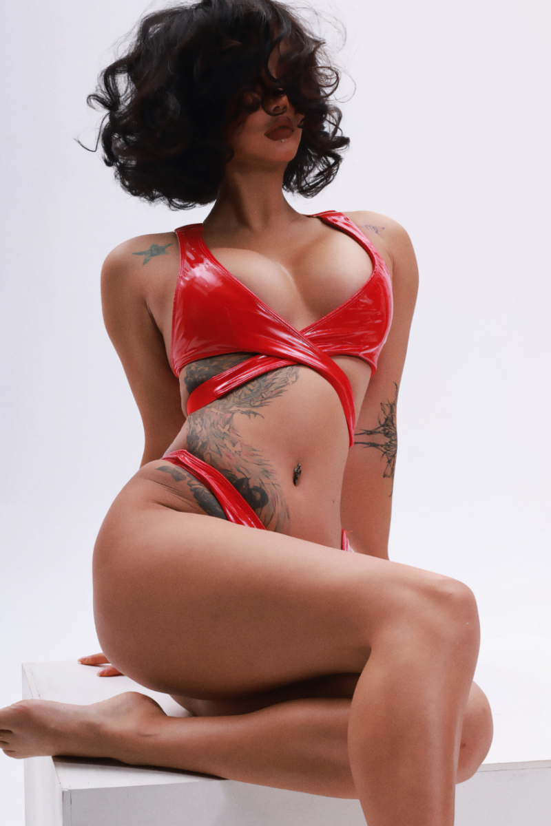 Forge your own fire. This flame-red top is armour for the bold, inspired by battlefield goddesses. The high-shine material catches the light, while a cross-wrap front and intricate strappy back create a striking silhouette. Finished with gold hardware, this piece is a weapon of mass distraction.