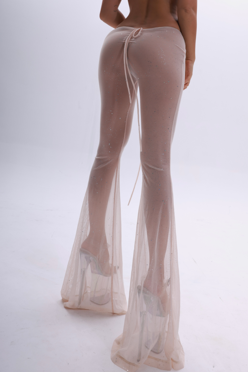 Celestial bodies in motion. These flow pants are totally sheer and dusted with star-like glitter for maximum shimmer. Designed for the skyscraper wearer, the extra-long flare is cut strictly for 8-inch heels and up. Featuring an adjustable rise and drawstring for your perfect fit.