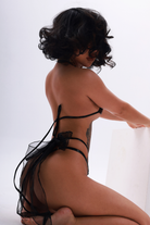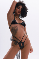 All tied up with a bow. These high-shine black bottoms are the gift that keeps on giving, featuring a super low-rise cut and daring double hip straps. A cheeky cut-out on the front adds a playful peek, while the reverse is all drama with an oversized mesh bow.