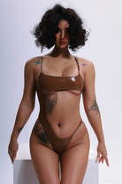 Rich, dark, and dangerously good. This coffee latte high-shine bodysuit is a shot of pure confidence. The gravity-defying asymmetric cut connects on just one side, creating a rebellious silhouette. An open stomach and back meet a super cheeky, high-leg cut for a look that's pure fire.