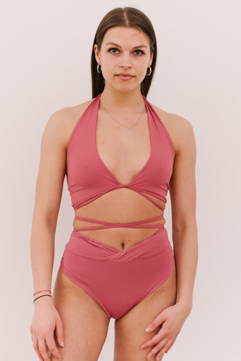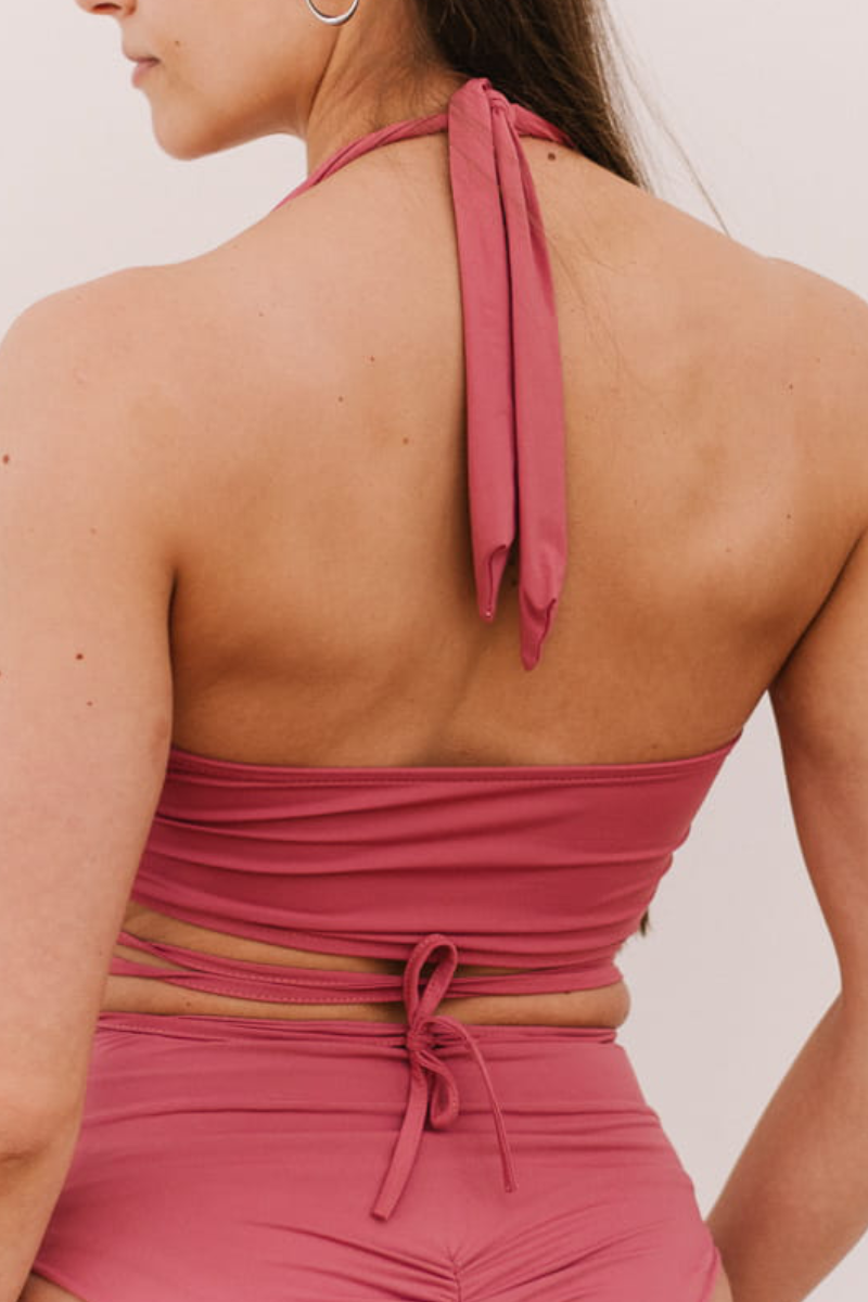 This dusty pink strappy halter features a plunging neckline and removable padding for adjustable support. Designed to feel soft against your skin while staying secure through every spin and climb, its versatile style adapts to your day. Plus, it’s swim-ready, making it perfect for poolside workouts. Feminine details, unstoppable performance.