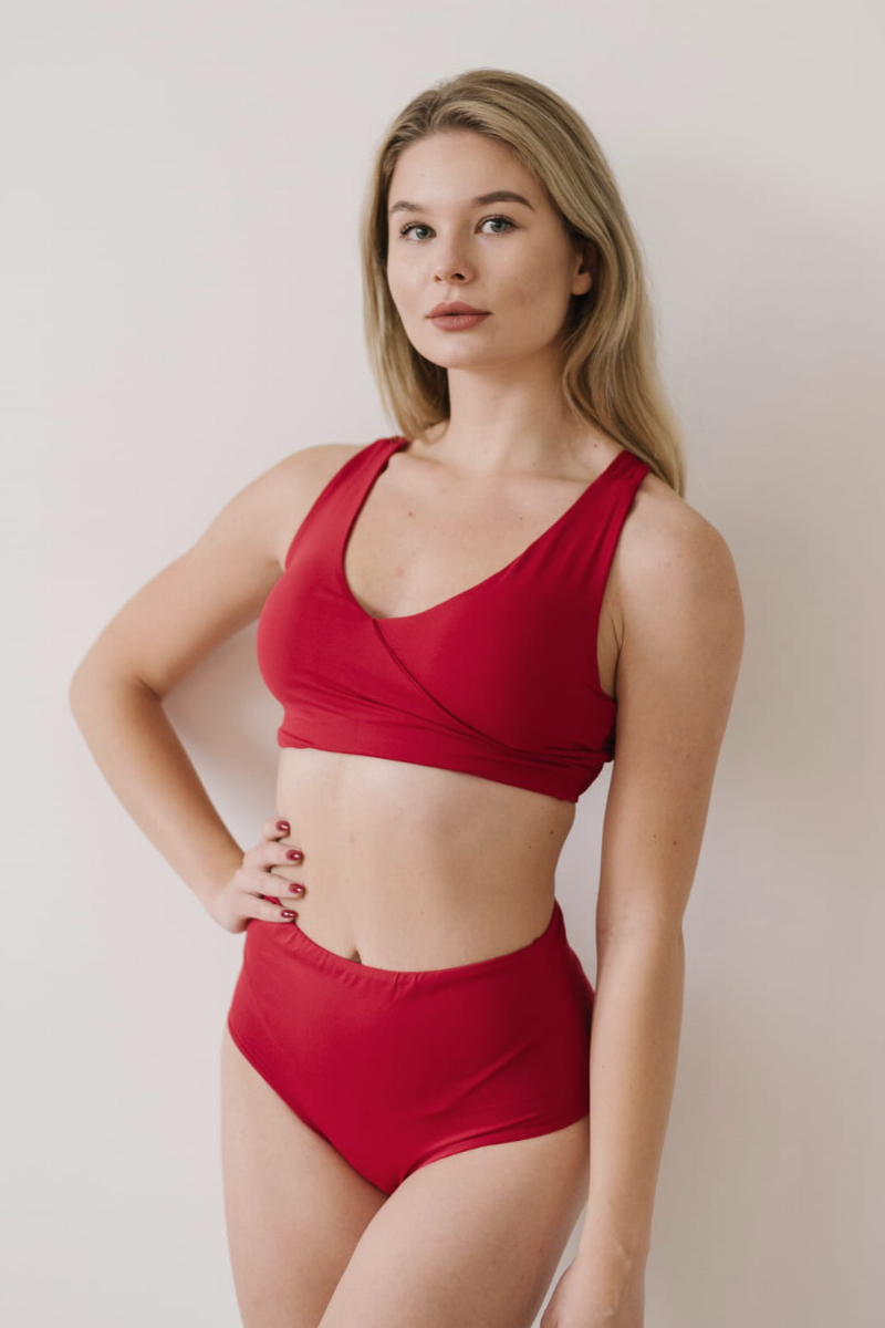 Sultry and strong, the Grace Top in cherry red is your new main squeeze. With a chic cross-back and flattering wrap-over design, it's made from a soft, swim-proof fabric that moves with you. Removable padding and a scoop neckline provide comfort and support. Ready to turn heads?