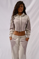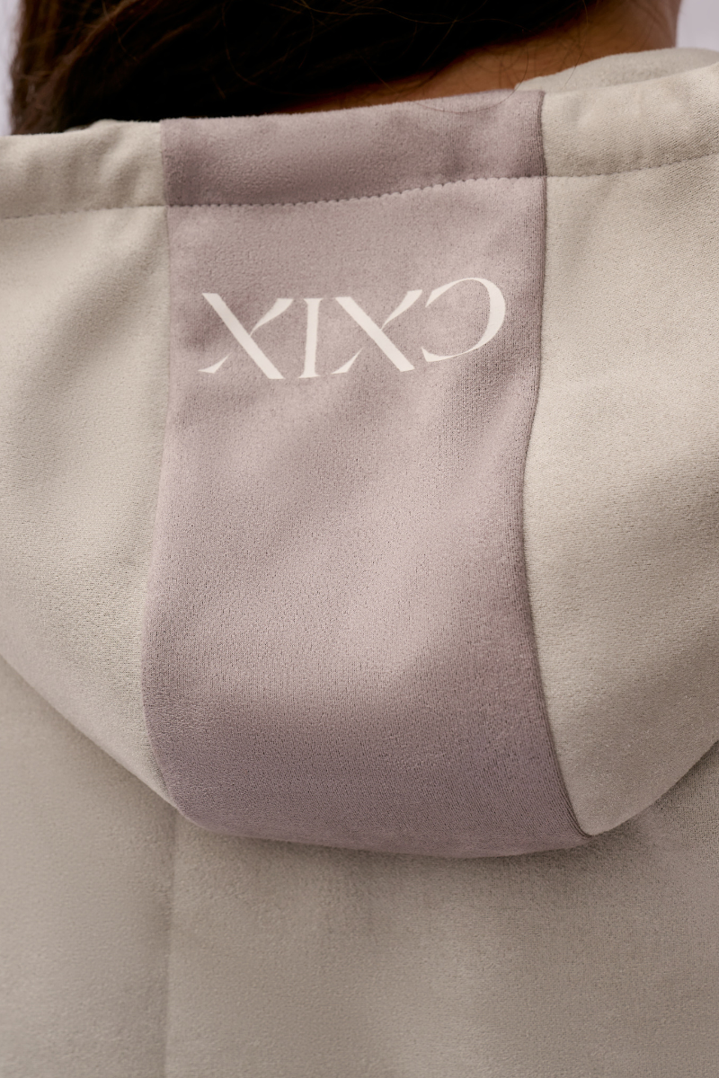 Crafted from ultra-soft, buttery faux suede, this cropped hoodie is made for flow mornings, airport fits, studio days, and everything in between. CXIX have found the most perfect faux suede fabric, bringing a unique lightweight alternative to loungewear that has a more elevated, chic and classic feel. Finished with tonal light stone & lilac-grey panelling for that effortless look. ☁️