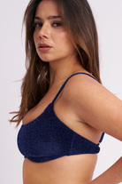 Serve midnight vibes with a shimmer that demands attention. This scoop neck top keeps it comfy upfront, saving the drama for the rear with textured scrunch strap details. The blue and black lurex glows against gold hardware, while adjustable straps and a bikini clasp ensure you’re locked in for every spin.