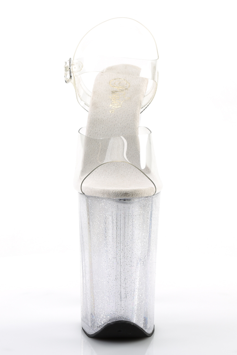Touch the sky in these gravity-defying 9-inch stilettos. Featuring a crystal-clear platform and heel dusted with micro glitter, they serve pure, unadulterated drama. These aren't just shoes; they're a dare waiting to be accepted.