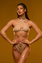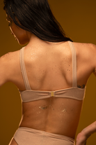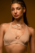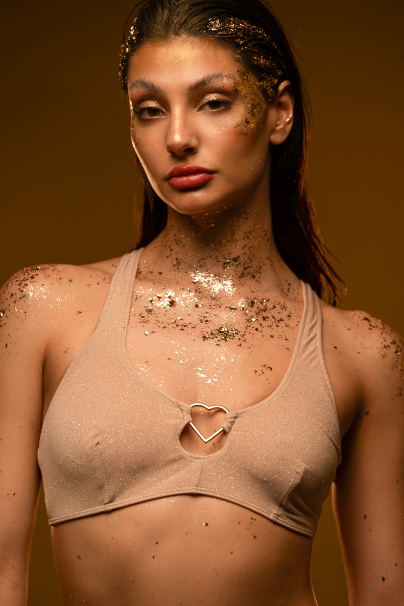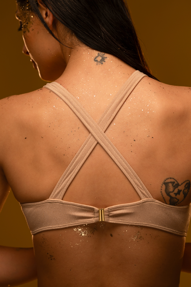 Your golden hour has arrived. This versatile top, spun from shimmering gold glitter, adapts to your celestial mood. Cross the straps at the front for a halter neck or at the back for a classic scoop. Lined, padding-free, and featuring a cute heart detail, it’s pure starlight.