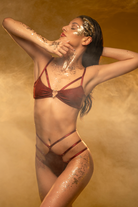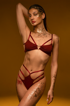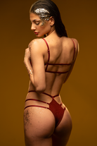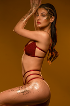 Stardust dipped in scarlet. These low-rise shorts are pure celestial fire. With a high-leg, cheeky cut and a barely-there fit, they feature a unique triple-strap design that bridges the front and back in shimmering chili red glitter. A daring, gravity-defying look for those who were born to shine.