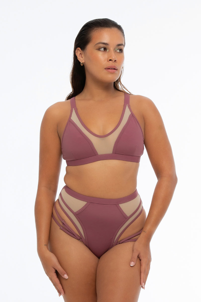 Your new favourite go-to for both comfort and style. Designed with a V-neckline and offering high support, it's perfect for those with slightly bigger busts. The adjustable back straps and convenient on/off back hook ensure a customized fit every time. With mesh front detailing that perfectly complements the Solace Bottoms, this top is as versatile as it is flattering.