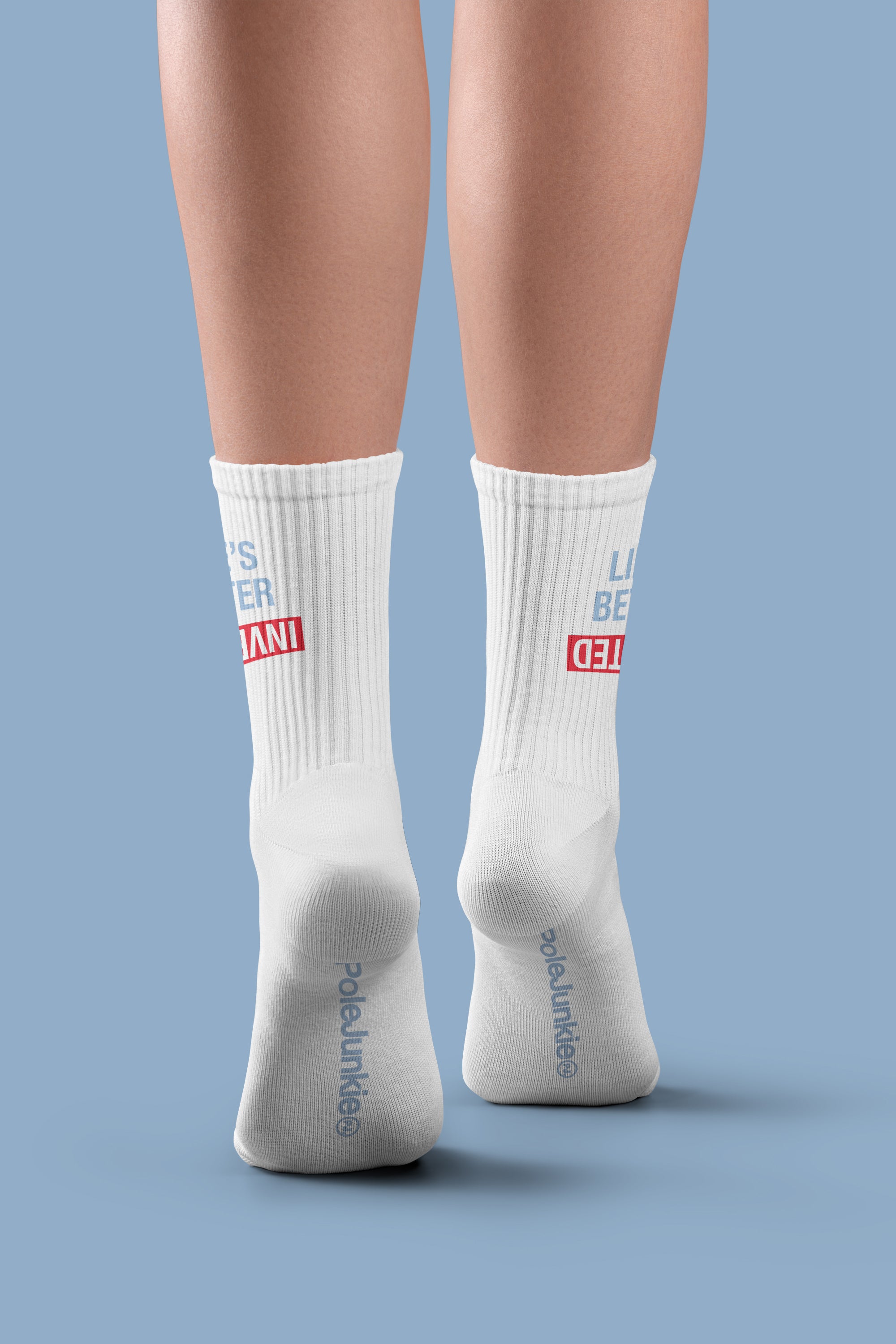 Turn your style upside down with Pole Junkie Inverted Socks - White. Featuring bold letter print, ribbed comfort, and a stretchy fit, these crew socks bring edge and attitude to every step!
