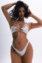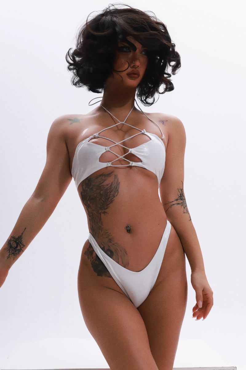 Innocence is a weapon. This pearl white bandeau is fallen angel energy, with a daring lace-up front and barely-there feel. The high-shine fabric gleams as you move. Wear it strapless or tie as a halter to unleash your divine power. Desire, weaponised.