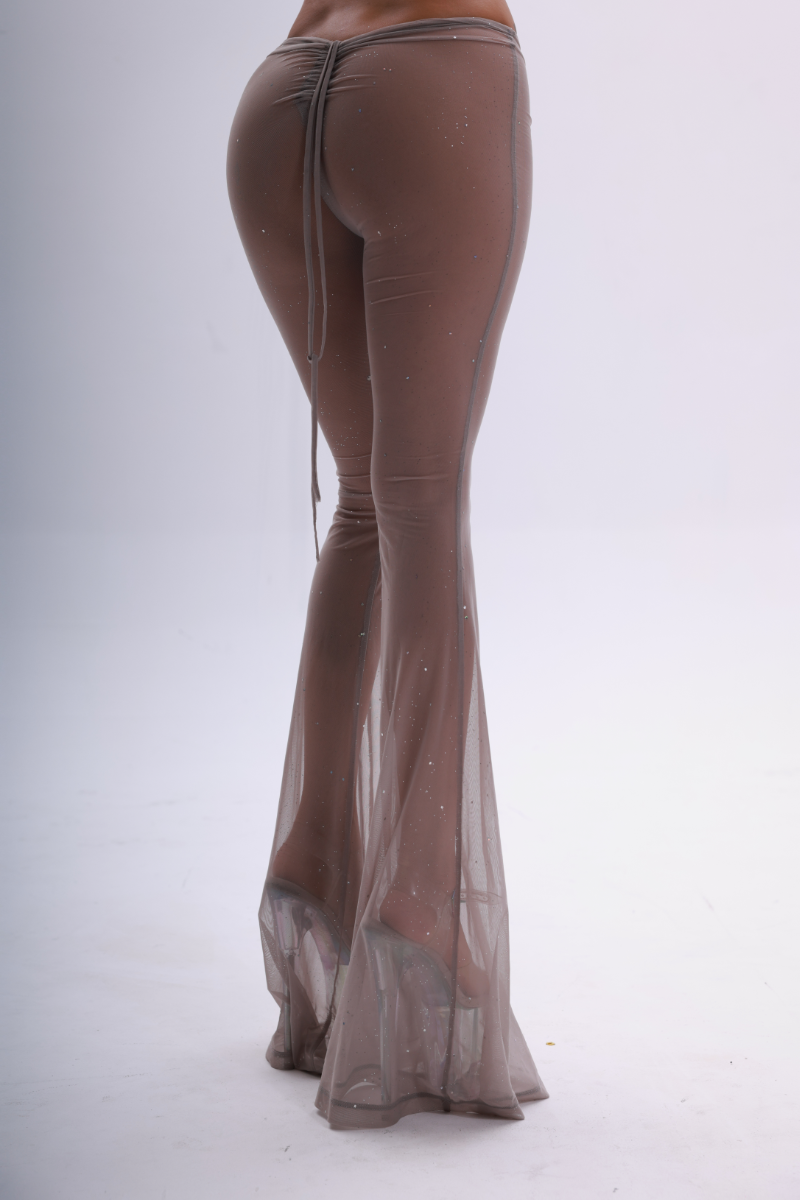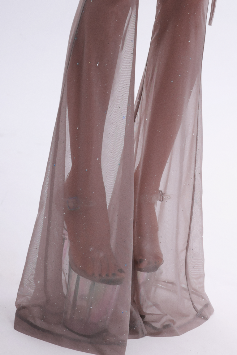 Drift through your flow like a celestial haze. These mesh pants are a whole mood. Scattered glitter catches the light like a distant galaxy, creating an otherworldly shimmer with every move. The flare design is cut extra long, perfect for sweeping floors in your tallest heels. An adjustable drawstring lets you decide the rise. Sultry, edgy, and completely hypnotic.
