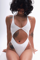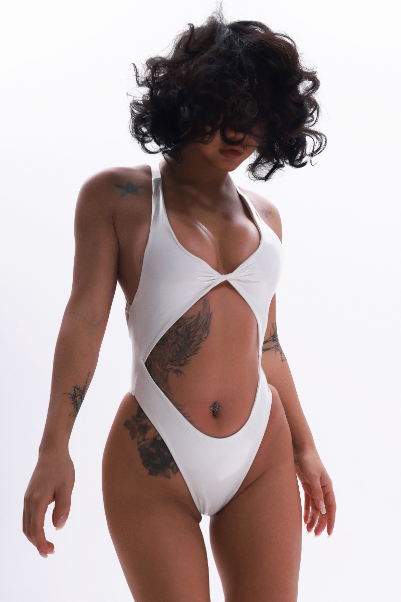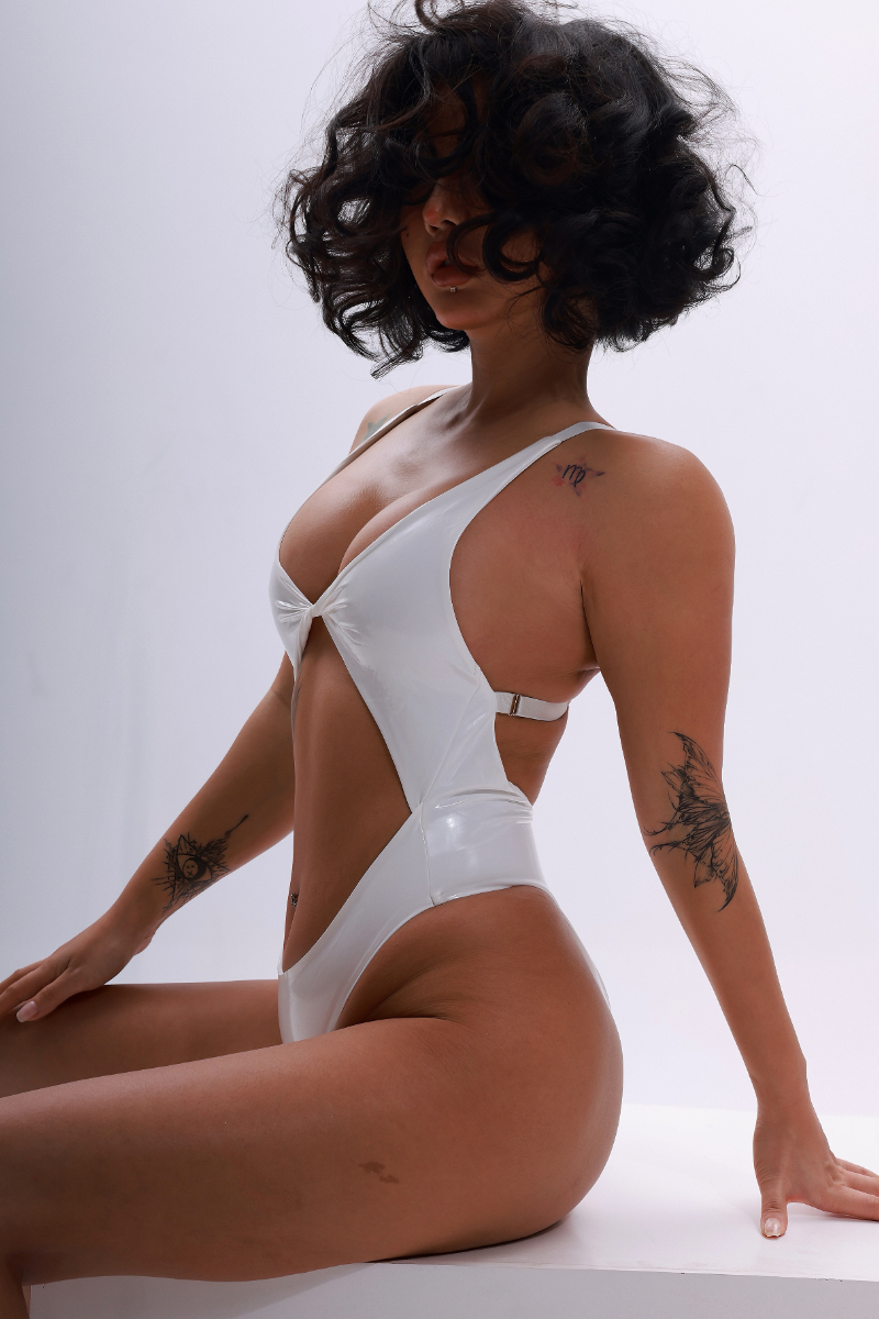 Angelic energy with a rebellious streak. This high-shine pearl white bodysuit is pure celestial power. It features a daring twist front and a low-rise cut that shows off your shape. The adjustable cross-back straps lead down to a super cheeky, high-leg cut. Divine.