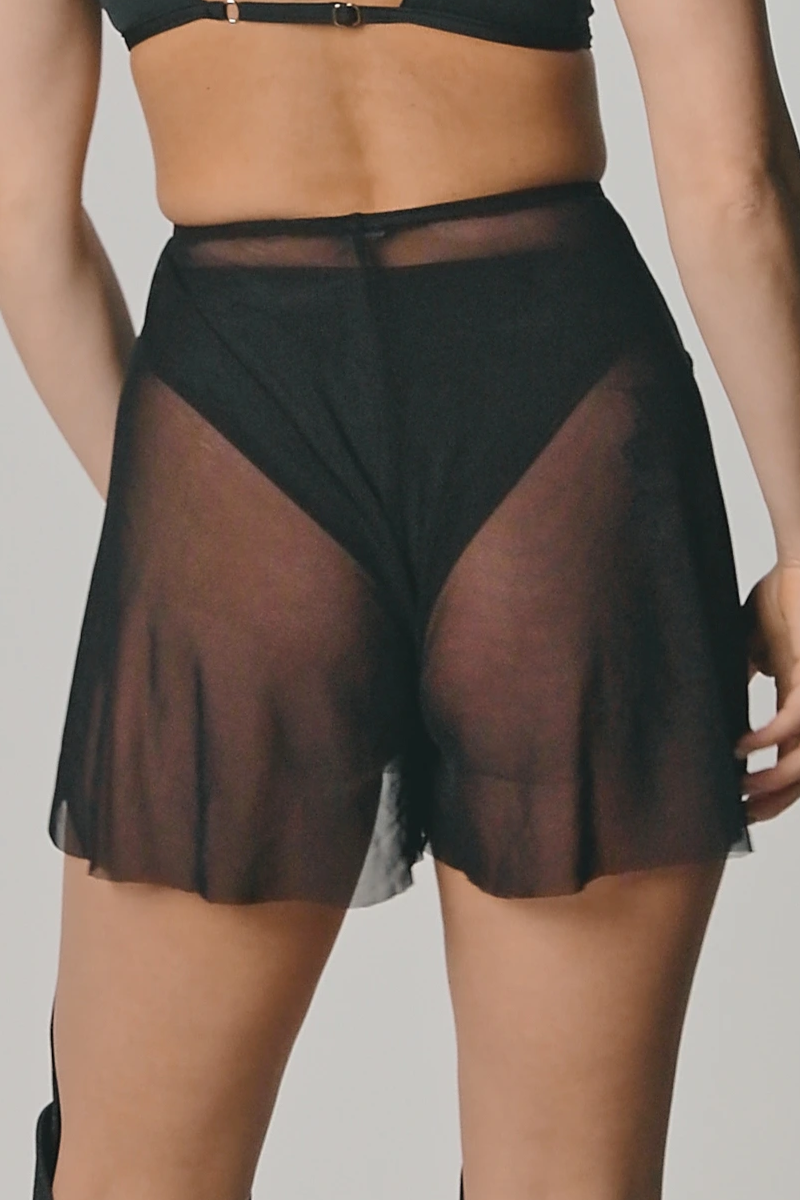 Layer on the drama. These totally sheer, black mesh shorts are lightweight, delicate, and unapologetically bold. Featuring daring side slits and a flowy cut that moves like smoke around your hips, they're the ultimate layering piece. Throw them over your favourite pole set to tease, reveal, and mesmerize. Handle with care, wear with attitude.