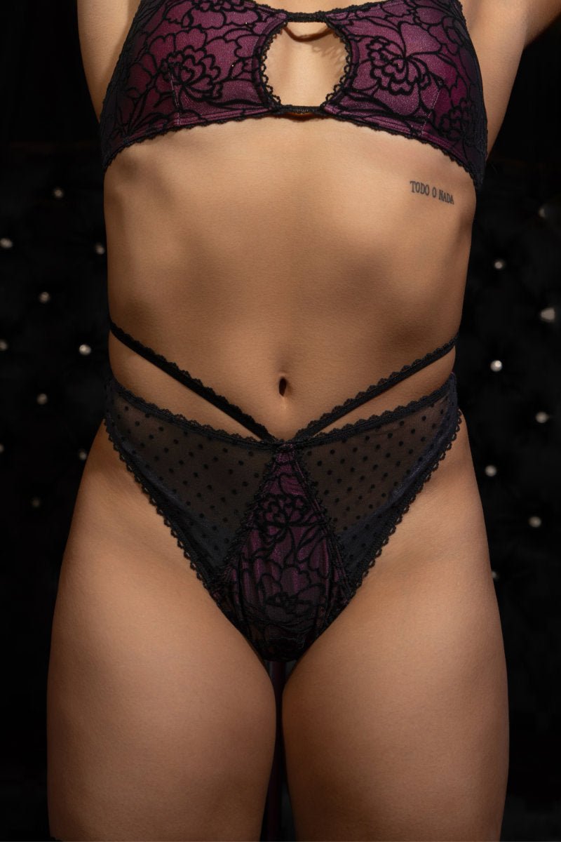 Indulge in sheer seduction with the irresistible RAD Tease Jadin Bottoms in Fuchsia with Black Mesh from the Tease Collection. Crafted from exquisite polka dot and floral mesh lined with luxurious fuchsia lycra, these bottoms feature daring sheer side panels and intricate lace waist straps. With a mid-waist fit and alluring moderate coverage, this bold and sexy piece is designed to command attention and ignite desire.
