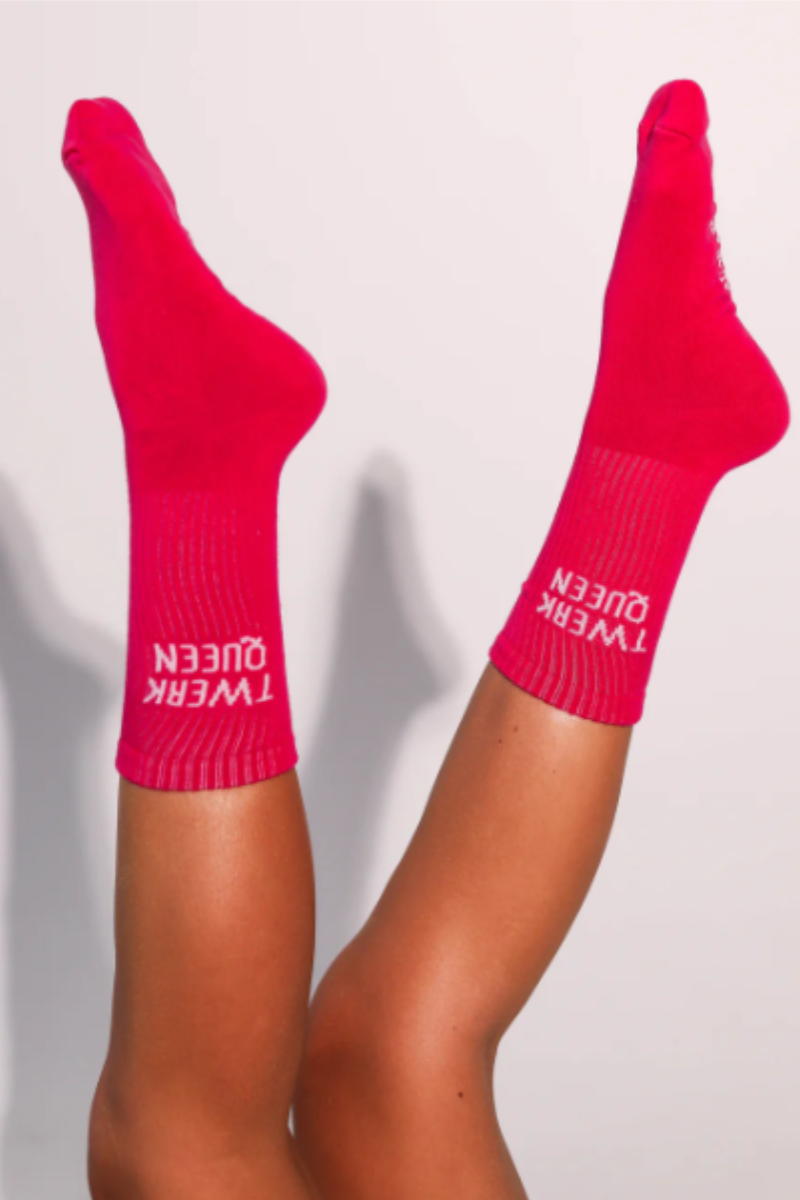 Crown your feet in confidence. These warm, pink crew socks keep it minimalist until you read the fine print: "Twerk Queen." Perfect for sliding into floorwork or keeping cozy between sets. With the REV ACTIV logo stamped on the sole.