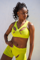 Bring the sunshine to the studio. This vibrant yellow lurex top is pure energy. The V-neckline has subtle cut-outs for a touch of intrigue, while the thick straps and racer back give you total support. All the heat of the carnival, ready for your every move.