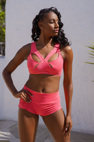 Sweet cheeks meet main stage energy. These high-waisted pink lurex shorts are all about the perfect fit, with a thick, supportive waistband and clever ruching. The scrunch bum detail enhances your curves while offering fuller coverage, leaving you free to move with pure, sparkling confidence.