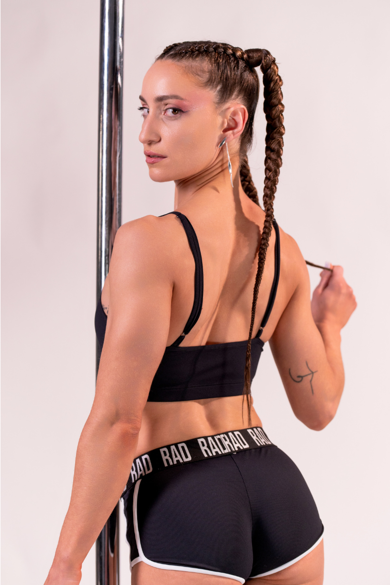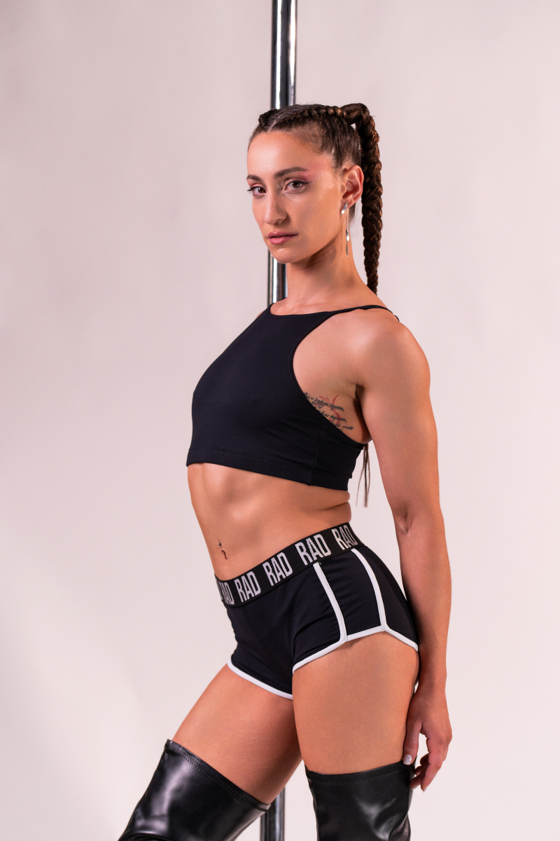 Retro vibes meet next-level comfort with RAD’s new pole shorts. Crafted from black ribbed material with white piping and high-waisted fuller coverage, they’re designed to move with you. The thick RAD-embellished waistband ensures a secure fit while adding style points.