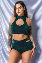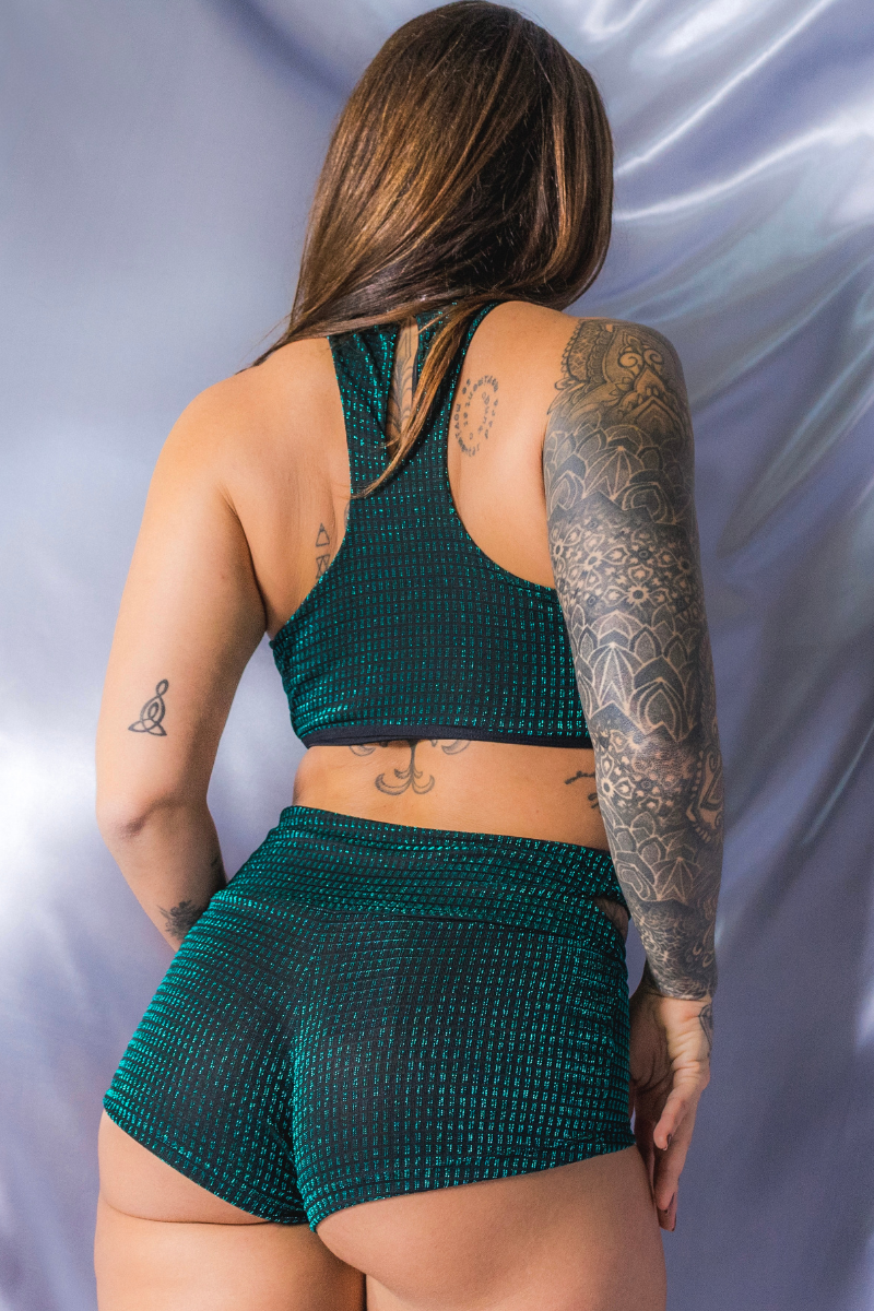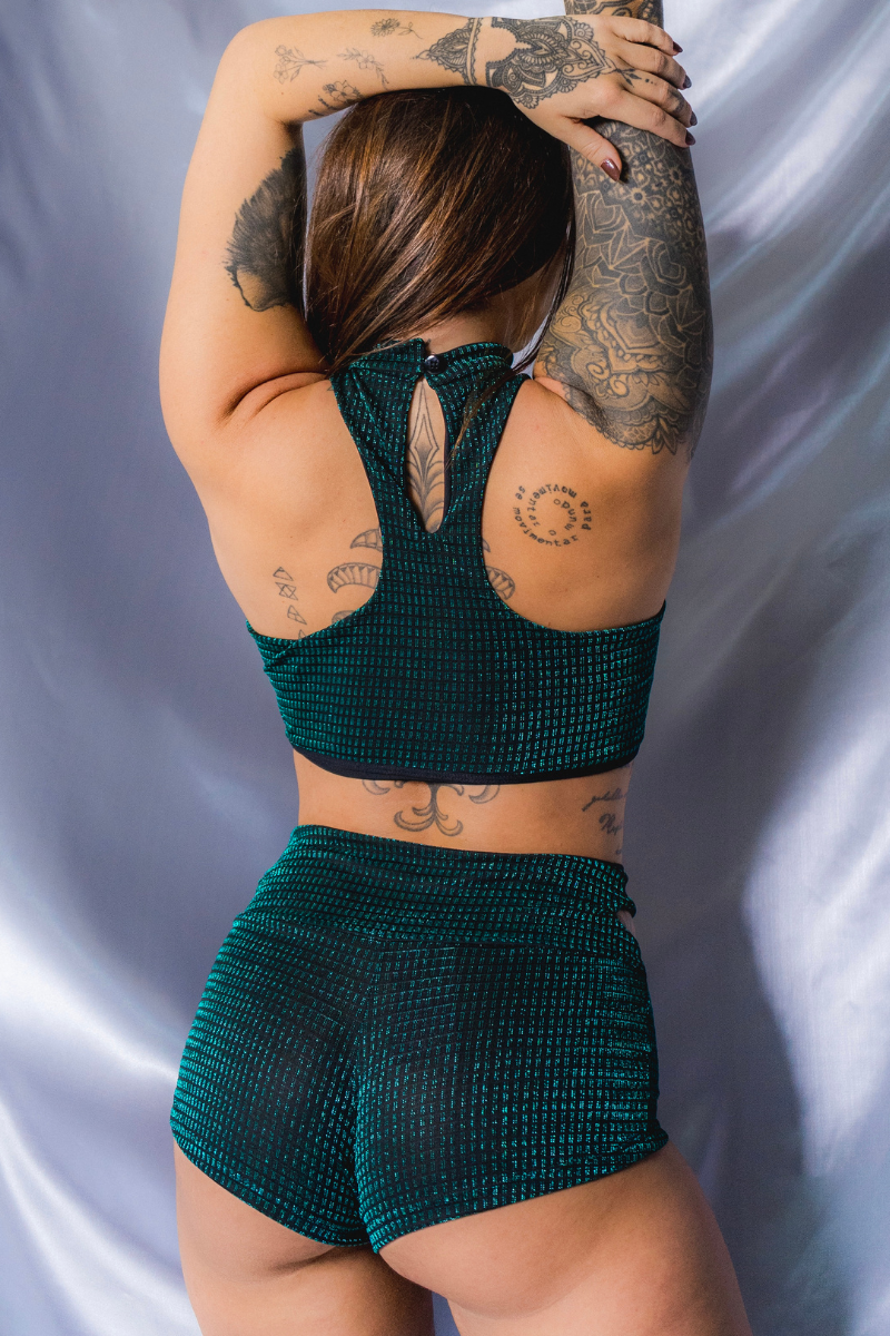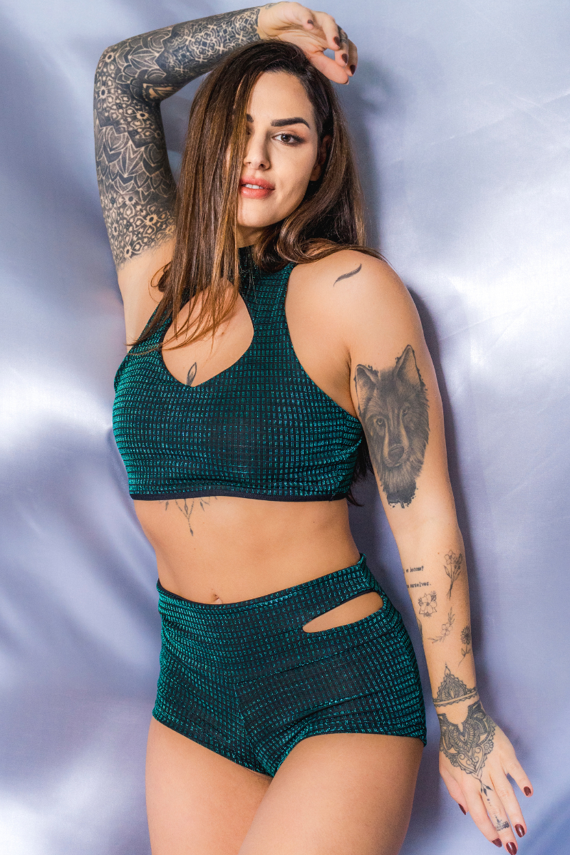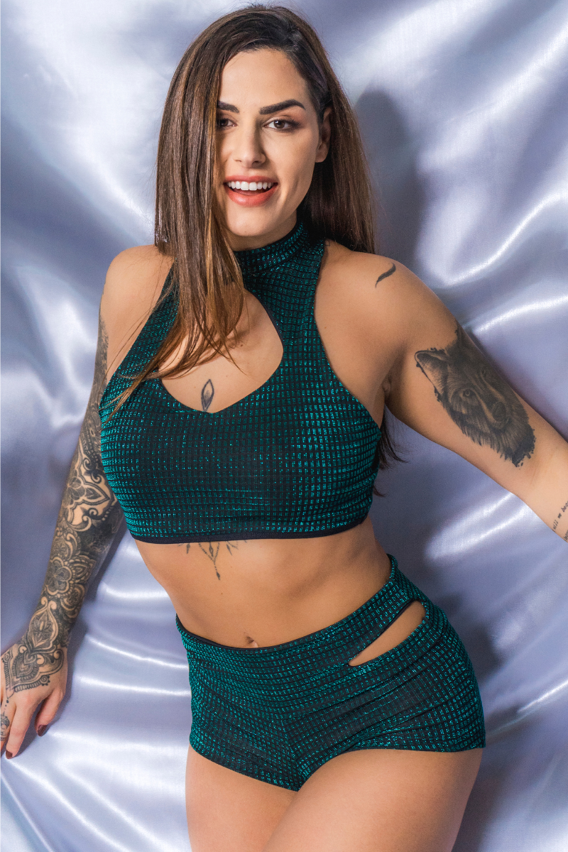 With its high neck, halter design, and racer back, this sparkly green Lurex beauty supports every spin, climb, and flip. The cute cut-out adds cosmic charm, while the double lining keeps you feeling unstoppable. Shine brighter than a supernova! ✨