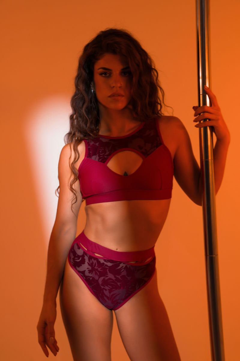 Araphel exudes the perfect blend of darkness and elegance with its deep red mesh and burgundy velvety floral print. The Bordeaux lycra, sassy front cut, and low scoop back offer versatility and bold sensuality for the ultimate bad girl vibe in pole dance.