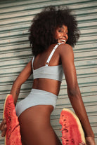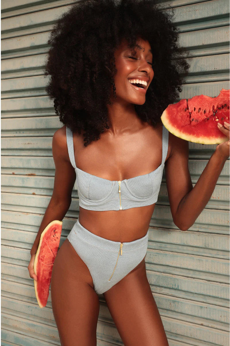 Drive them CRAZY in these Britney inspired bottoms from Rolling. Fabricated in sparkly navy blue lurex, with a cheeky front gold zipper and mid-rise waist.