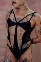 • Black Cirrê Fabric |  Open back Design | High-cut legs | Sheer mesh panels on the sides | Strappy front | With Geometric Cutouts | Adjustable Straps | V-shaped cutout | Scoop Neckline