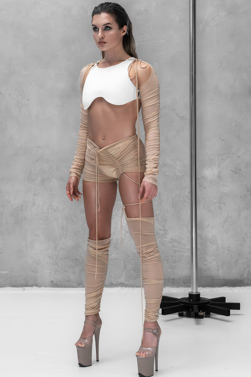 Styled here with Shadowbanned Mesh Shorts, Pray Harder Leg warmers, Vortex Twisted Thong, and Vortex Twisted Top
