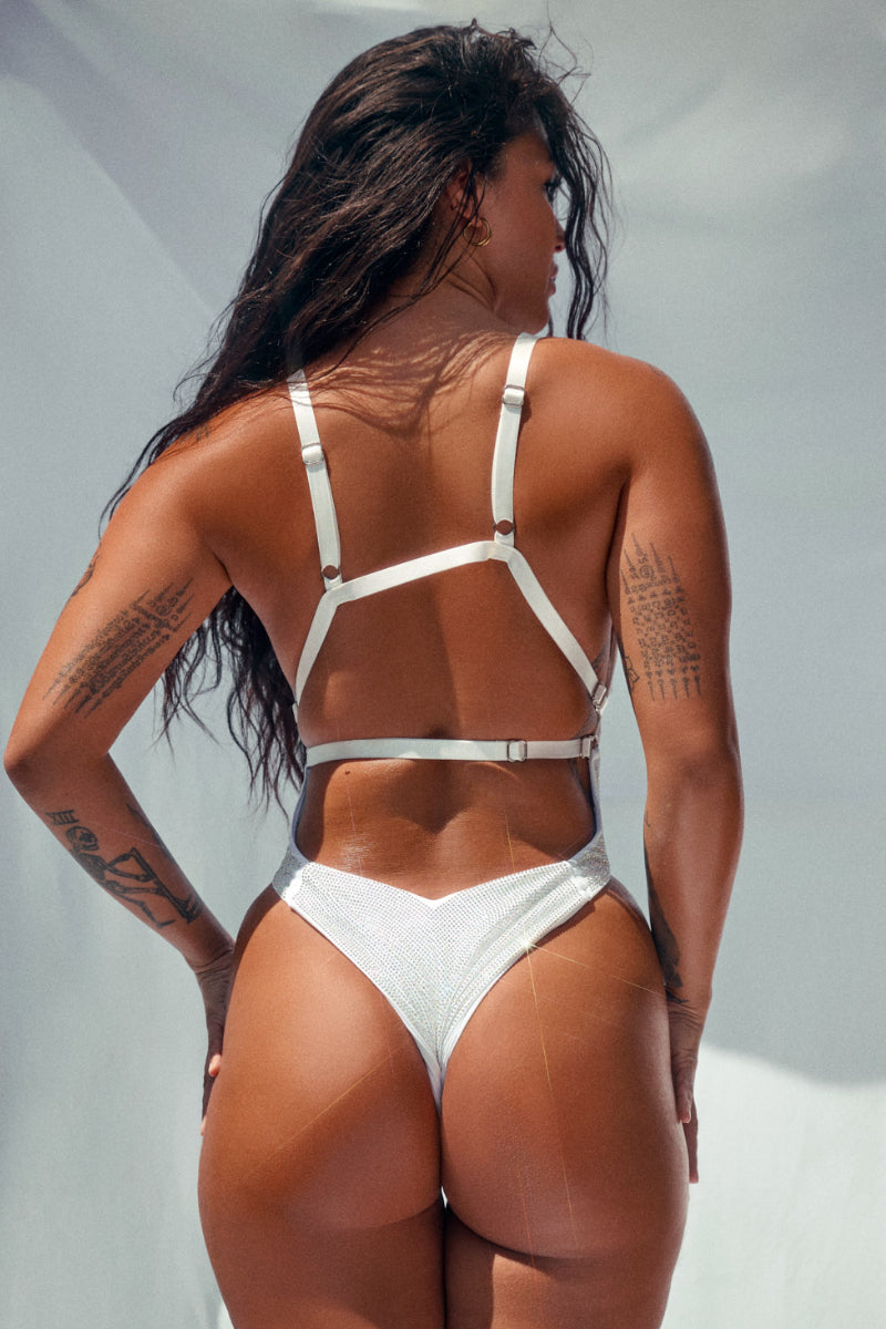CXIX Aphrodite Bodysuit - White Iridescent Rhinestone Drip