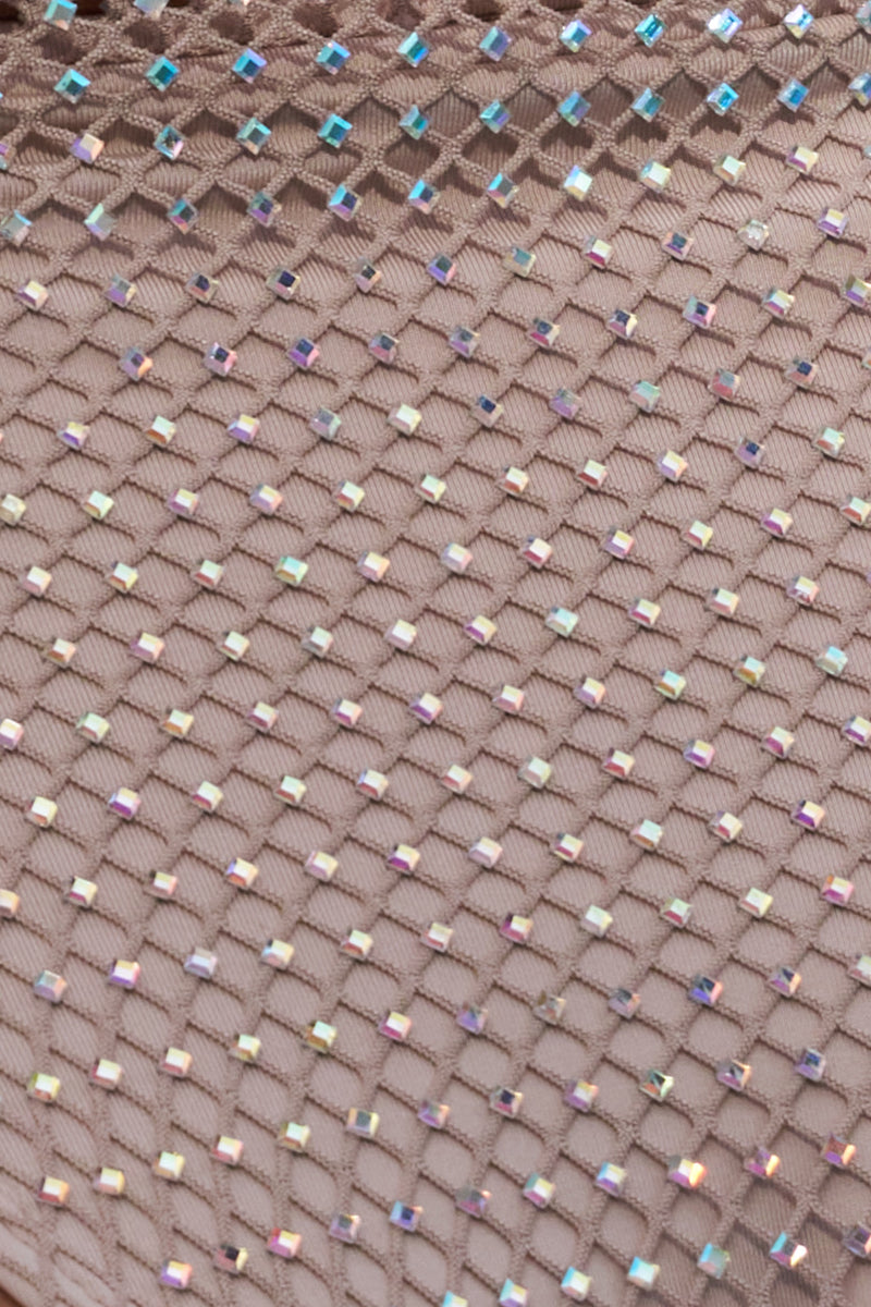 Designed to sparkle as brightly as you do! Featuring Latte Smooth Fabric, a diamanté encrusted fishnet overlay, adjustable straps, and gold hardware for that luxe summer vibe. Perfect your moves in style and confidence!
