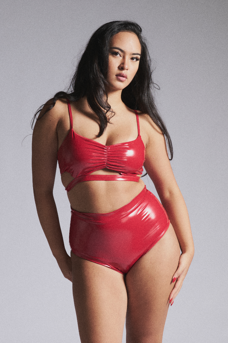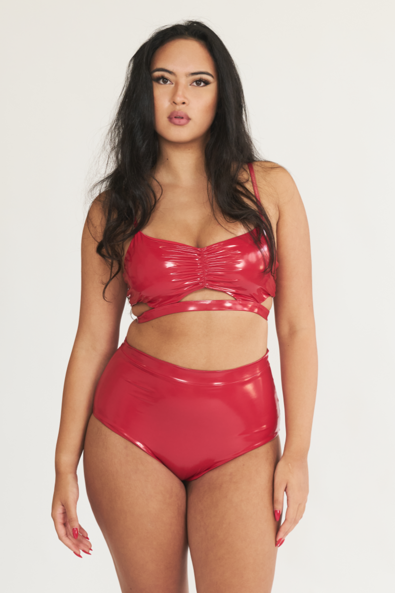 This high-shine red PU top is designed to melt hearts and minds. With a flattering scoop neck and a tempting under-bust cut-out, it’s pure fire. Details like a cute front scrunch, adjustable straps, and non-removable padding ensure a perfect, comfy fit for your most dangerous moves.