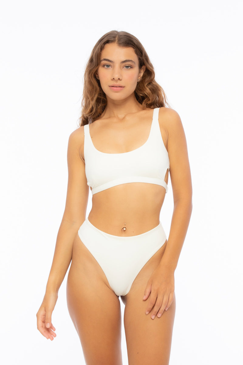 • High leg cut and cheeky | Minimal coverage | Clever stitched loop for garter attachment | Double lined | Sustainable fabric | Swimwear