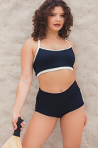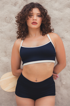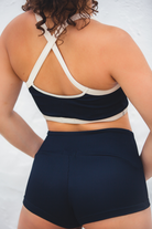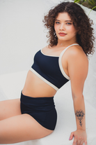 Channel your inner retro queen! Featuring a bold colour-block design, scoop neck, and flirty cross-back straps, it's double-lined for confidence with every spin. The ribbed knit in classic black with white piping brings vintage vibes to your pole flow ✨